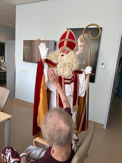 Tot slot ging het gezelschap naar de huiskamer van geriatrie. De Pieten maakten grapjes en deelden lekkers uit, terwijl de Sint aandachtig luisterde naar de verhalen van de patiënten. Bij het vertrek werd hij uitgezwaaid met een vrolijk gezongen “Dag Sinterklaasje”.