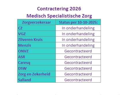 Wij willen graag contractafspraken maken met alle zorgverzekeraars, zodat u met uw zorgverzekering terecht kunt in ons ziekenhuis voor alle verzekerde ziekenhuiszorg. De contractonderhandelingen met de zorgverzekeraars voor 2026 lopen momenteel. Hieronder kunt u de status zien: